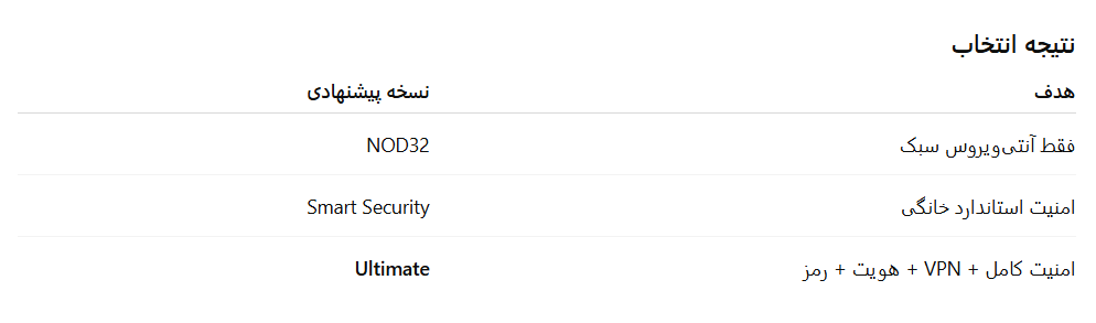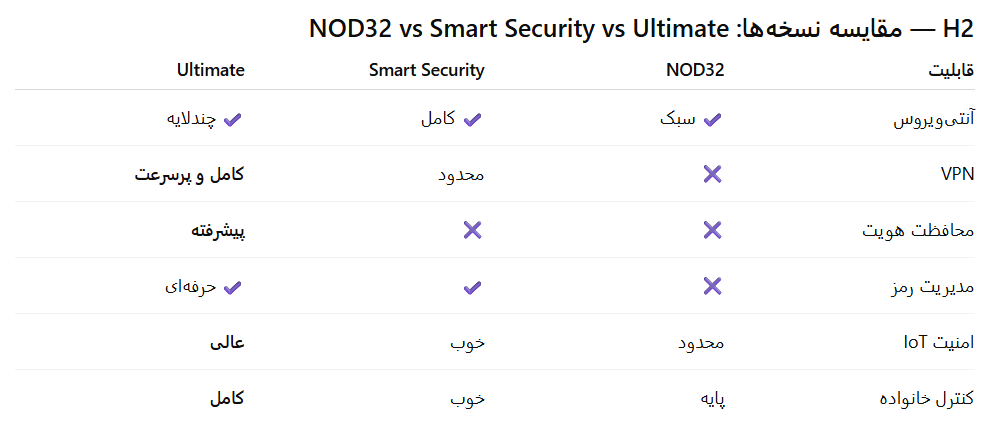 H2 — مقایسه نسخه‌ها: NOD32 vs Smart Security vs Ultimate